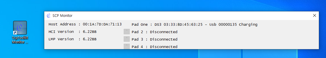 설치 후엔, PC를 키면 프로그램이 자동으로 실행되게 되어 있습니다. 자동실행 끄는걸 찾아봤는데.. 이건 아직 찾질 못했습니다..ㅠ,ㅠ 아무튼... 결론은 자동으로 실행되기 때문에, 동글이와 듀얼쇼크3를 케이블로 연결하면 띵! 소리나면서 연결되는걸 확인할수 있습니다. 연결이 된 상태를 보시려면 SCP Monitor라는 프로그램을 실행하시고, 위에 진행했던 것처럼 확인하시면 도움이 되실겁니다.